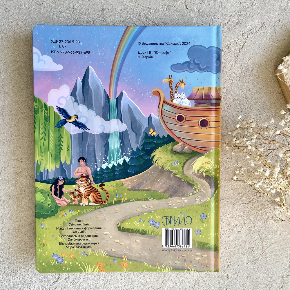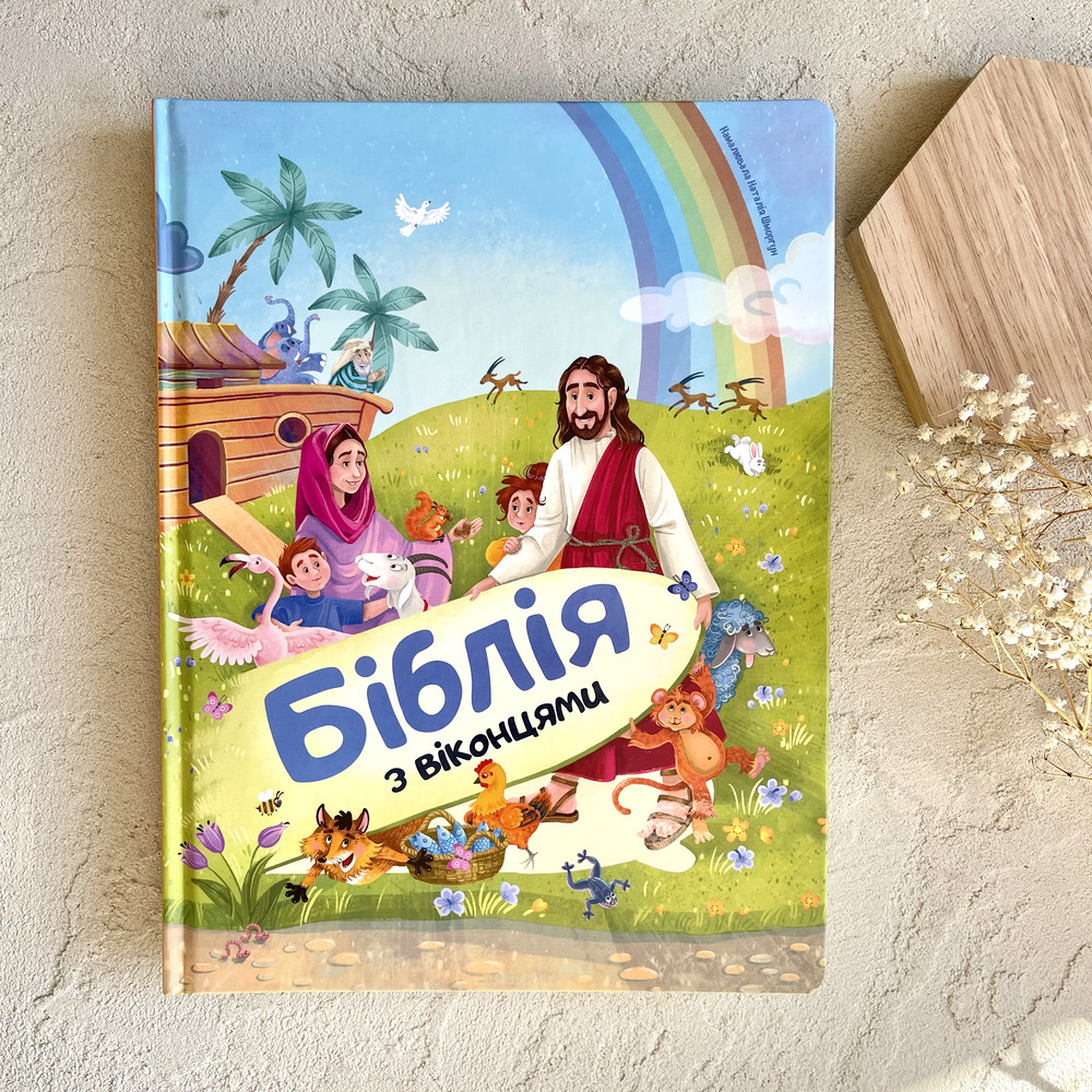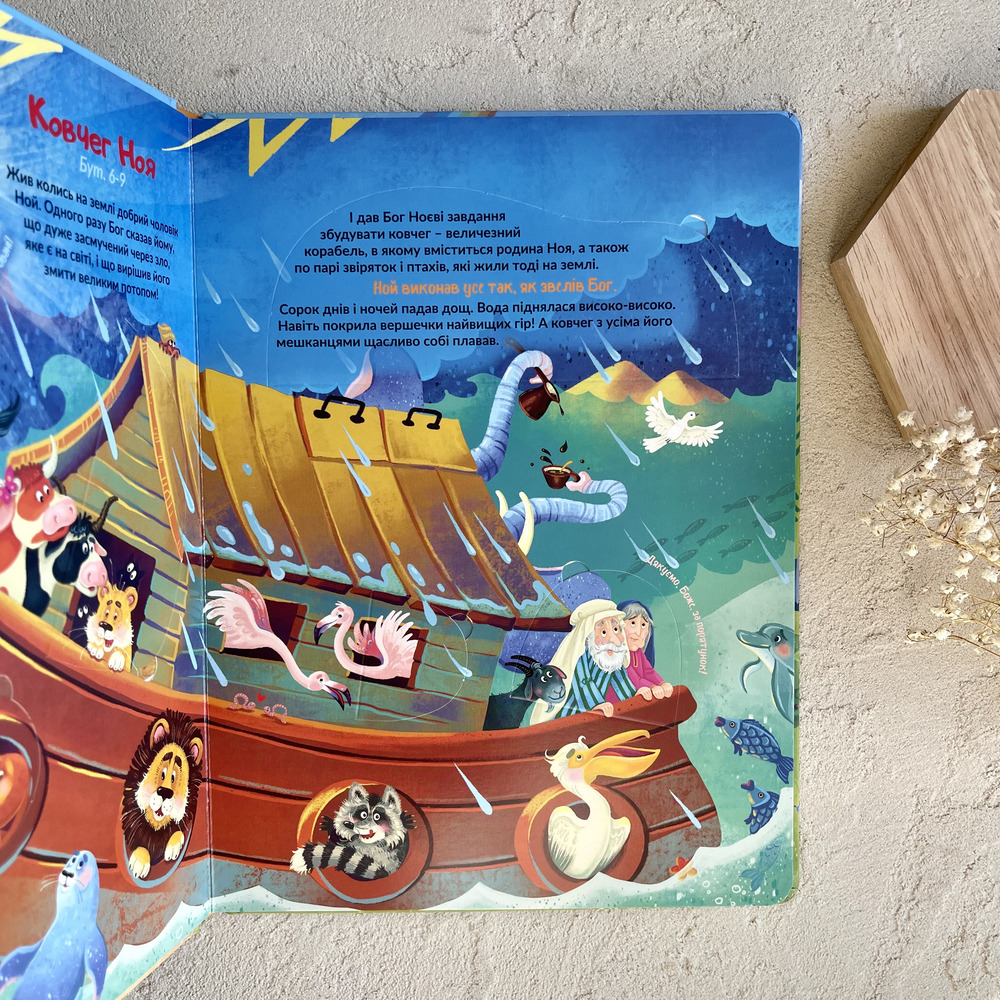 7 барвистих розгорток присвячено 8-м Біблійним темам: Сотворення, Ковчег Ноя, Давид і Голіаф, Різдво, Нагодування хлібом, Добрий самарянин, Розп’яття — Воскресіння. Чудові ілюстрації і стислі тексти закомпоновані у потайні віконця, відкриваючи які дитині буде цікаво і весело знайомитися з біблійними історіями.