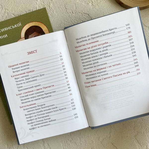 Універсальний іспит сумління допоможе підготуватися до Таїнства Сповіді. План читання Святого Письма на рік заохочує практикувати щоденне читання Біблії. Наприкінці молитовника — кілька сторінок для вписування імен померлих, за яких молиться родина.