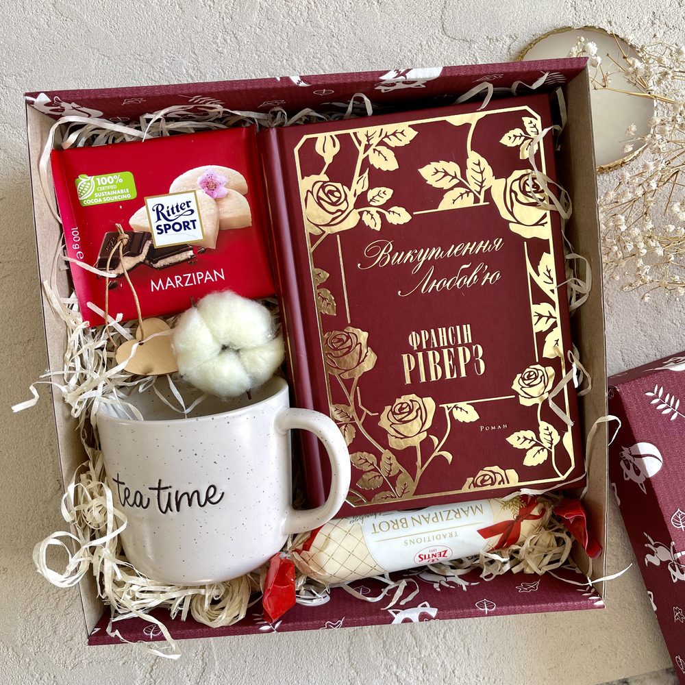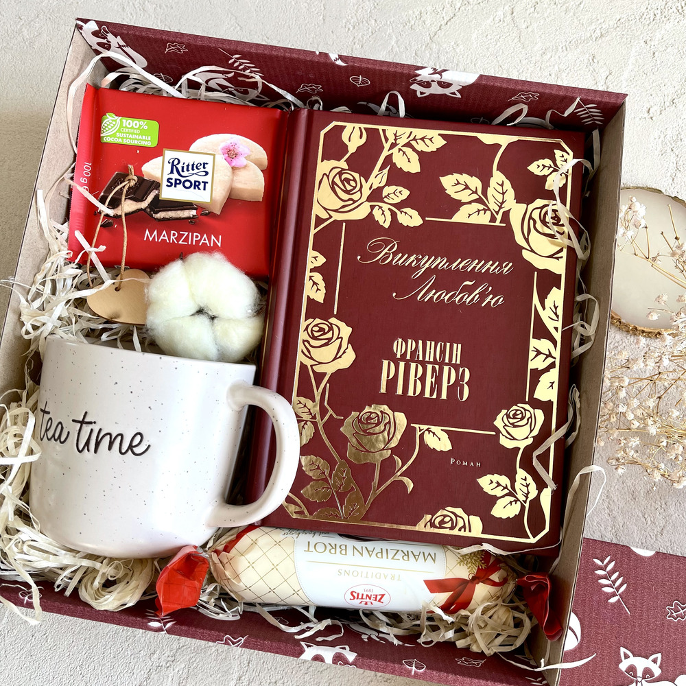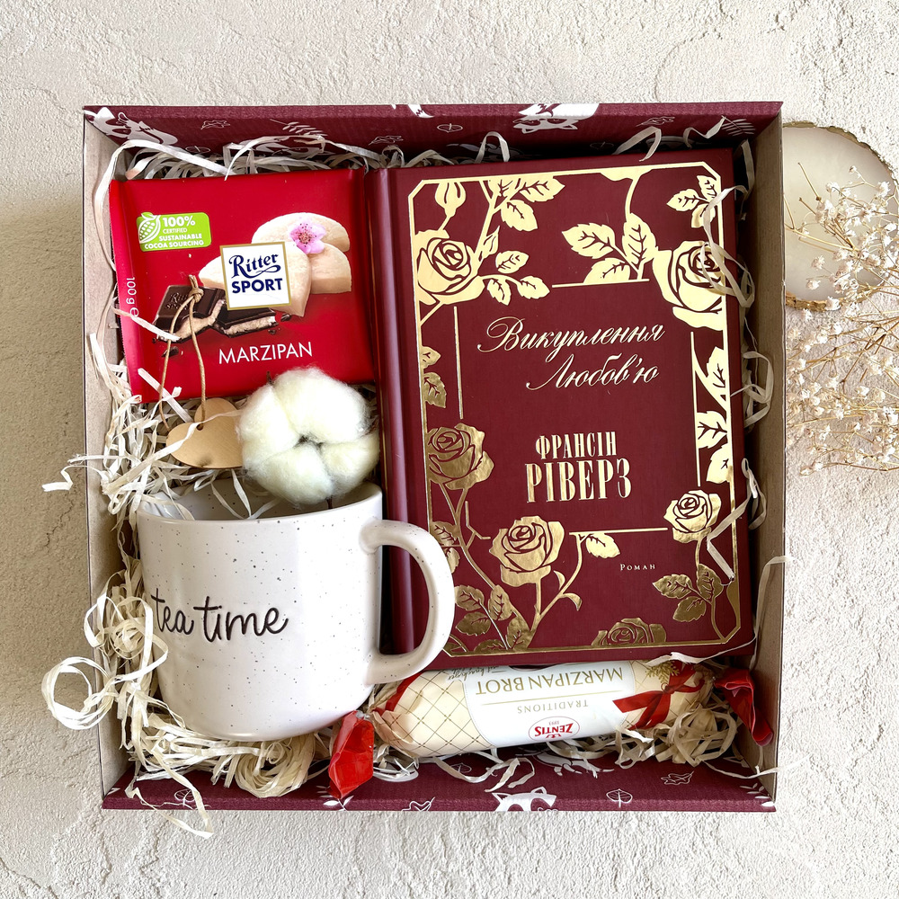 ➡️ Коробка з наповнювачем; ➡️ Книга «Викуплення любов’ю»; ➡️ Шоколадка, марципан; ➡️ Горнятко; ➡️ Бавовна, сердечко дерев’яне;